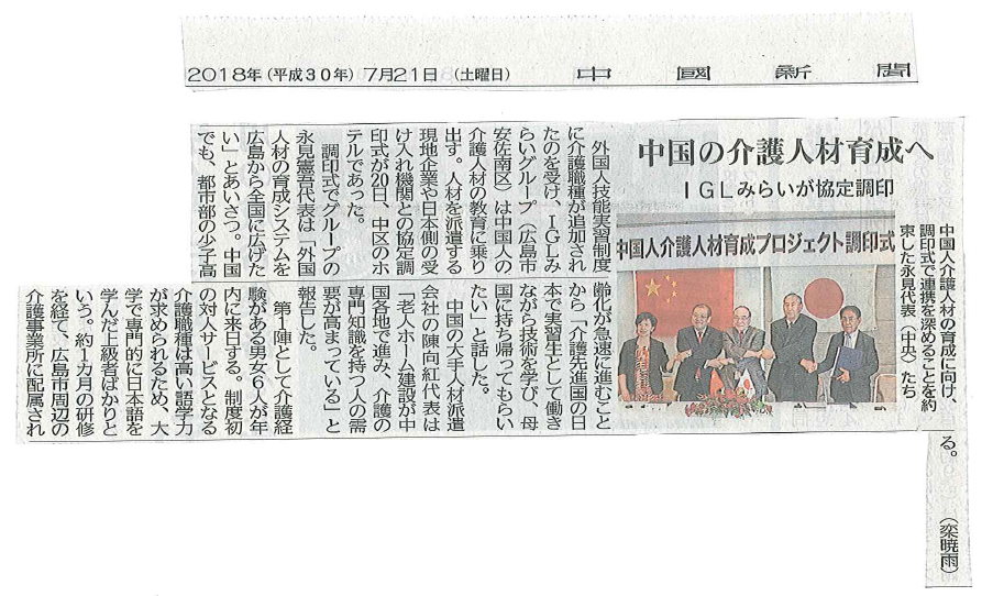 在日中国人の数が100万人時代を迎え、埼玉県川口市では日本人と中国人によるコミニティー作りが始まっています。時代の変化と来るべき高齢化社会に向け、内田総研グループは、日中連携による「介護人材の育成」に向け、7月20日、広島で日中企業による調印式を挙行しました。(資料添付)